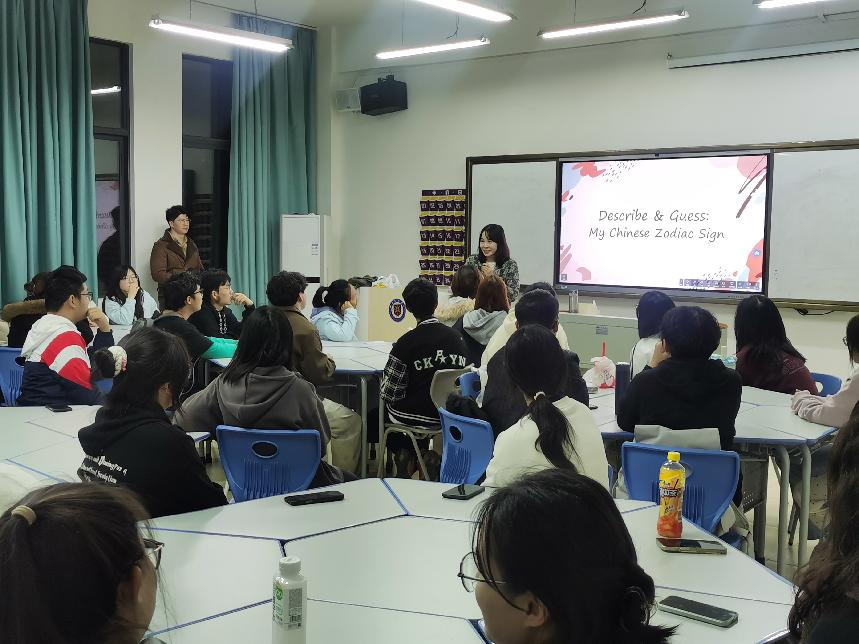 本次英语角以“中国文化”为核心,设置两大平行主题活动,同步在两个教室有序推进。黄佳卉老师与张鹏彪老师共同带来“中国生肖”主题分享,通过生肖起源故事讲解、英文词汇拓展、趣味互动问答等形式,让同学们在轻松氛围中掌握生肖文化的英文表达,深入理解其背后的民俗内涵与象征意义。另一边,黄延康老师以“labubu带你了解中国节日”为主题,借助热门IP形象增强活动趣味性,通过节日习俗演示、绘画等环节,带领同学们领略春节、中秋、端午等传统节日的文化魅力。