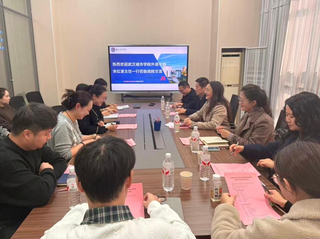 11月19日下午,武汉城市学院外语学部主任宋红波带领学部骨干教师与行政管理人员代表,到访我校外国语学院开展交流座谈活动。学院党总支书记何婷、副院长武艳霞牵头,组织教研室主任、骨干教师及辅导员代表共同参与,双方围绕外语学科建设相关的重点工作展开友好深入的探讨。
