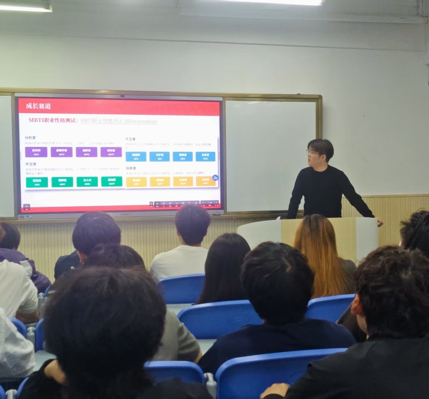 为帮助学子精准定位职业方向,刘飞重点讲解MBTI职业性格测试的应用。他现场演示测试方法,说明其能科学匹配职业类型,为职业目标设定提供理论支撑。同学们认真记录要点,纷纷表示将运用该工具完善备赛方案。