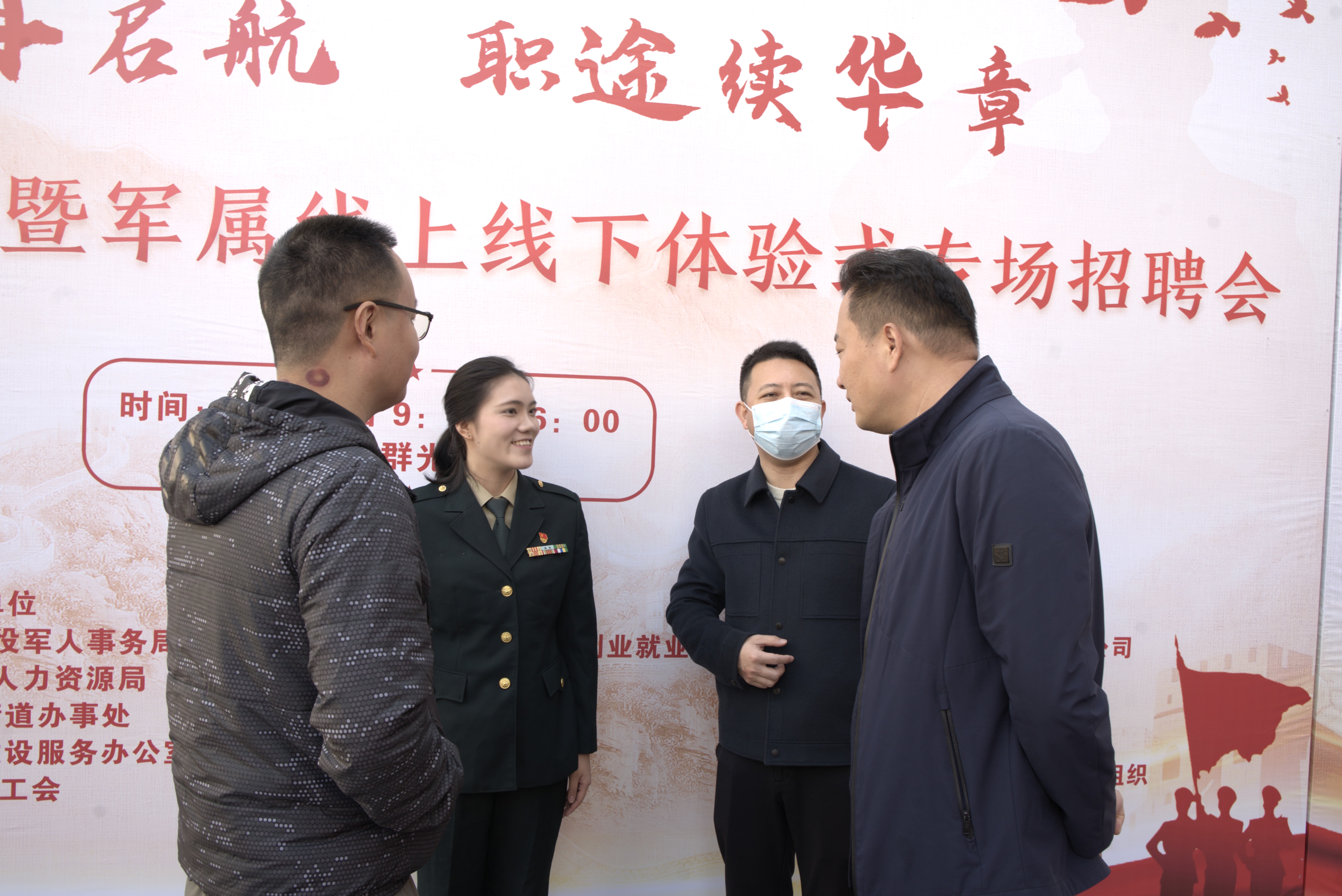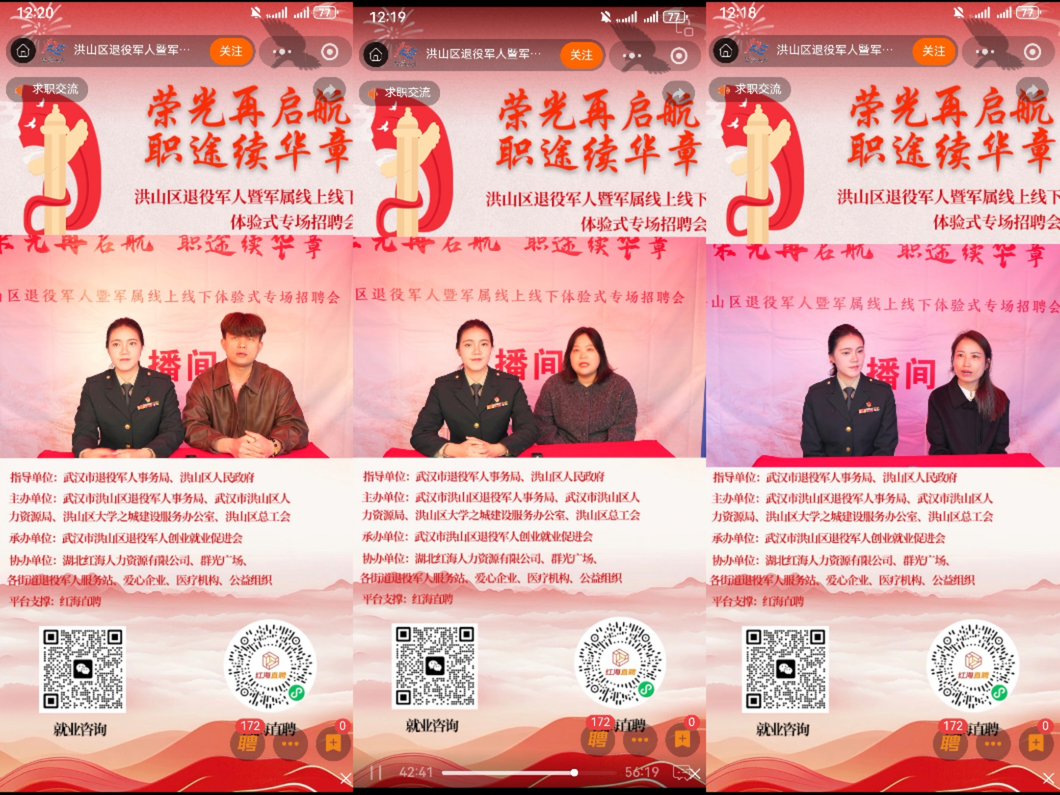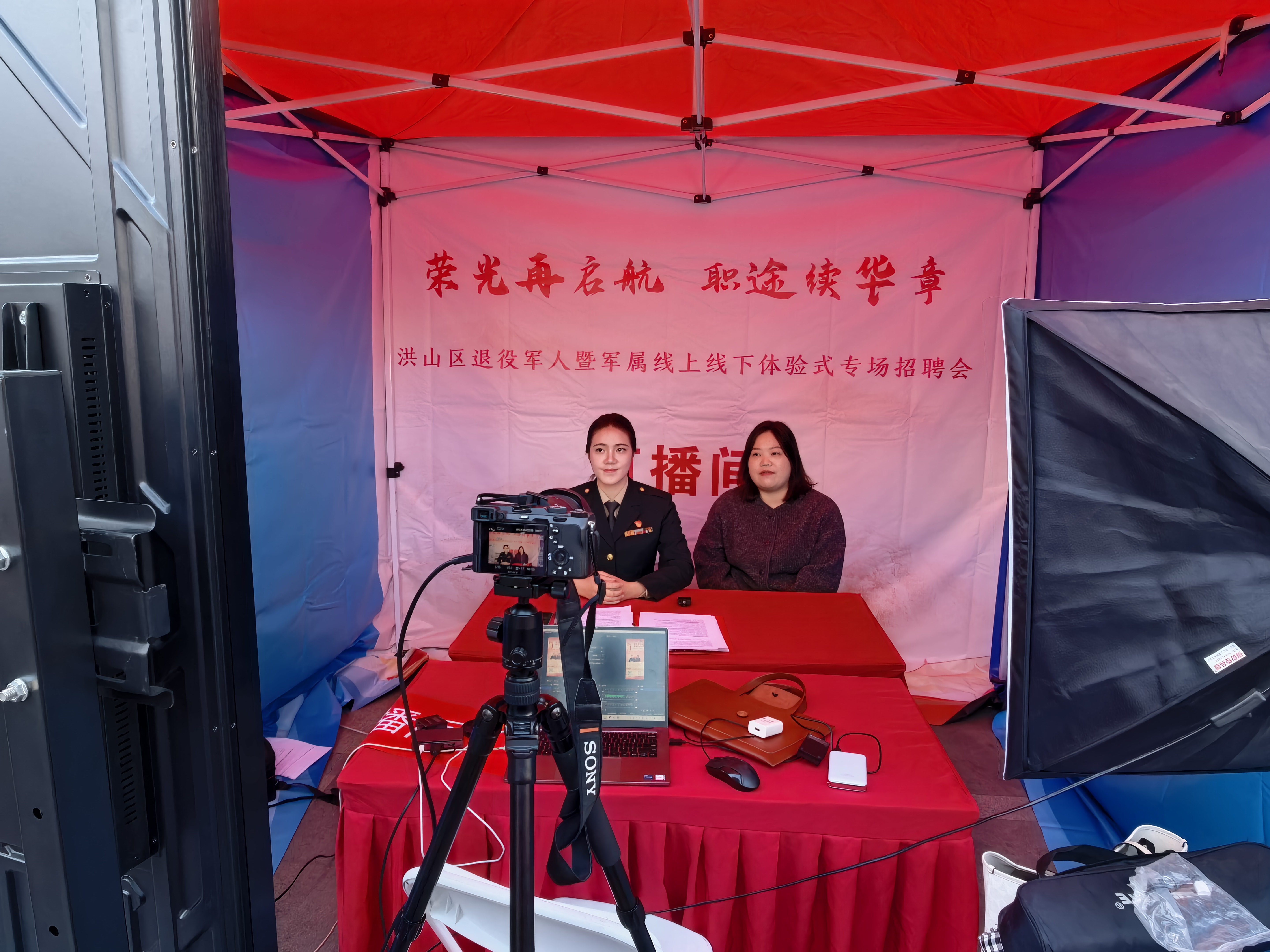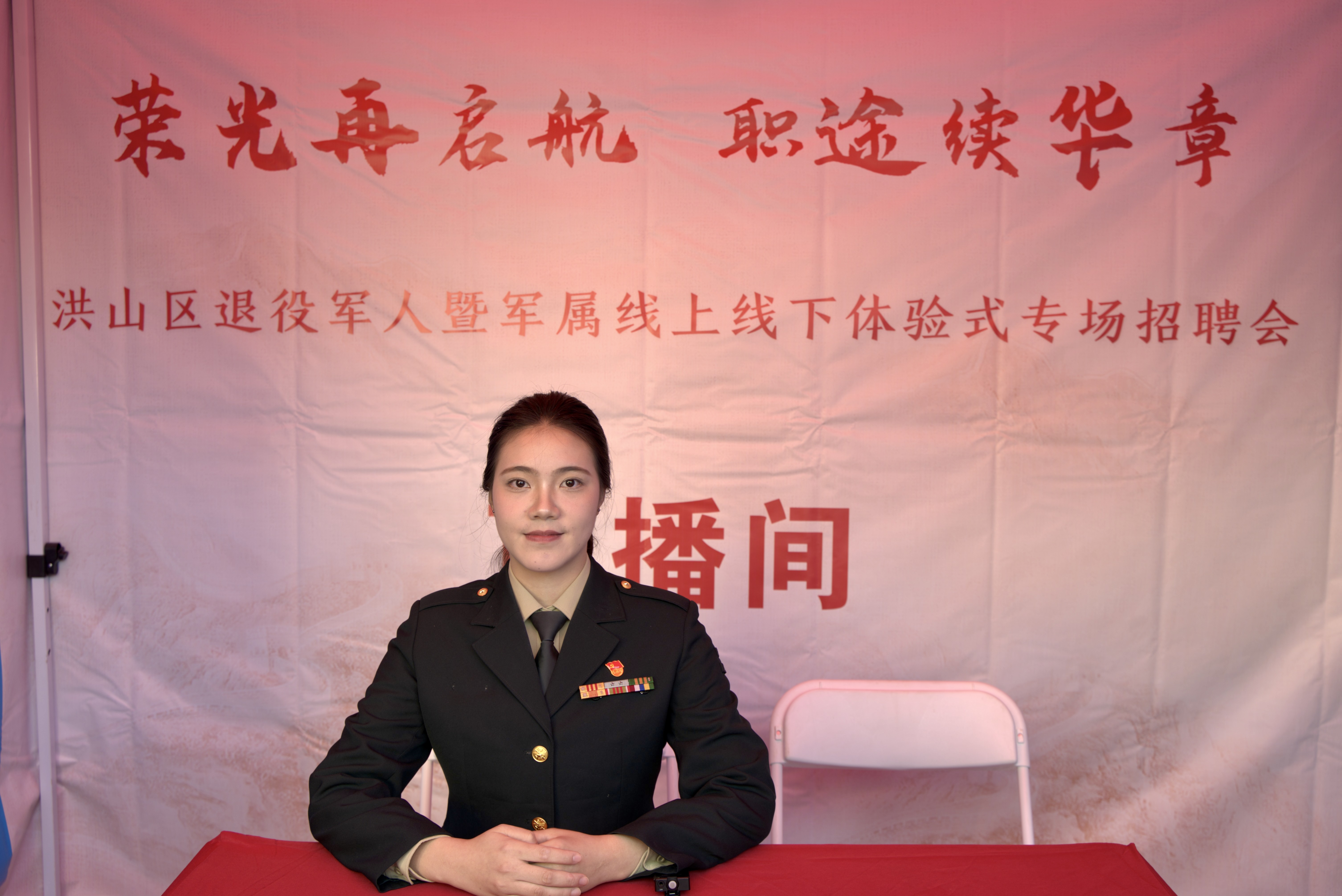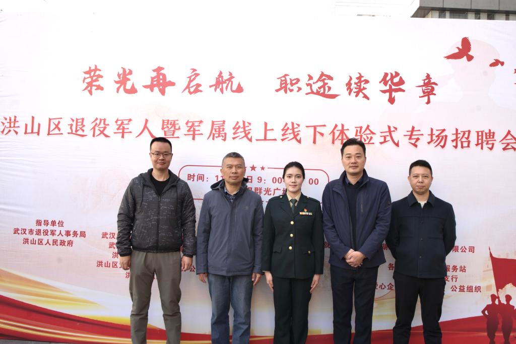 11月30日,由武汉市退役军人事务局、洪山区人民政府指导,洪山区退役军人事务局、洪山区人力资源局等多家单位联合主办的“荣光在启航 职途续华章”洪山区退役军人暨军属线上线下体验式专场招聘会在群光广场隆重举行。我校经济与管理学院退役女兵、24金融本1班学生毕婧怡担任本次招聘会线上直播主持人,以军人的严谨担当与青年的蓬勃朝气,为广大退役军人搭建起与企业对接的优质平台,助力战友们在职业新赛道上续写辉煌。