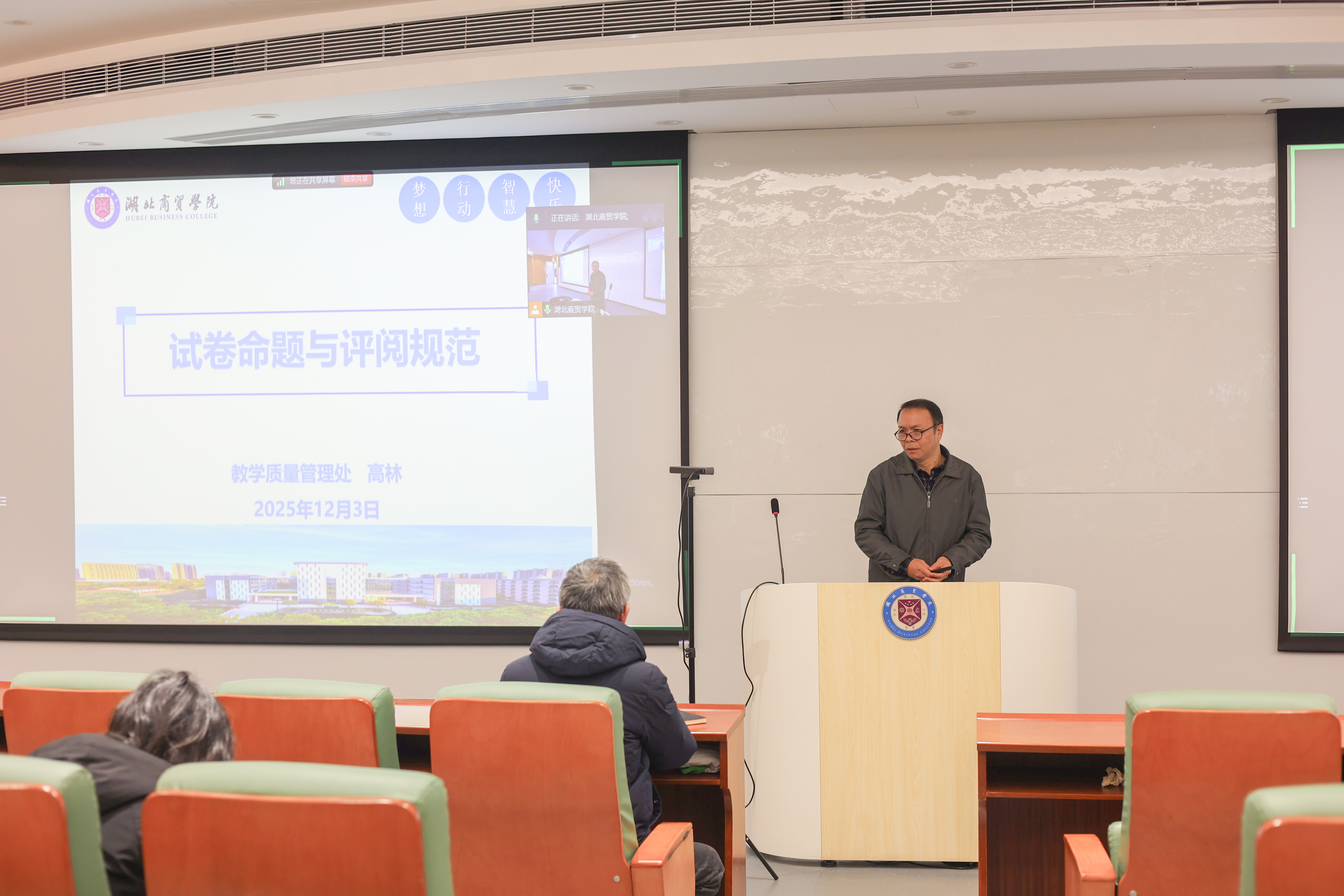 为进一步提升课程考核命题与试卷评阅质量,12月3日下午,教学质量管理处联合教务处组织开展了2025年秋季学期课程考核命题与试卷评阅专题培训。武汉校区教师在鸿博楼J1现场参会,咸宁校区教师通过集中观看直播方式同步参与。培训由教学质量管理处副处长肖大群主持,教学督导员高林教授主讲。