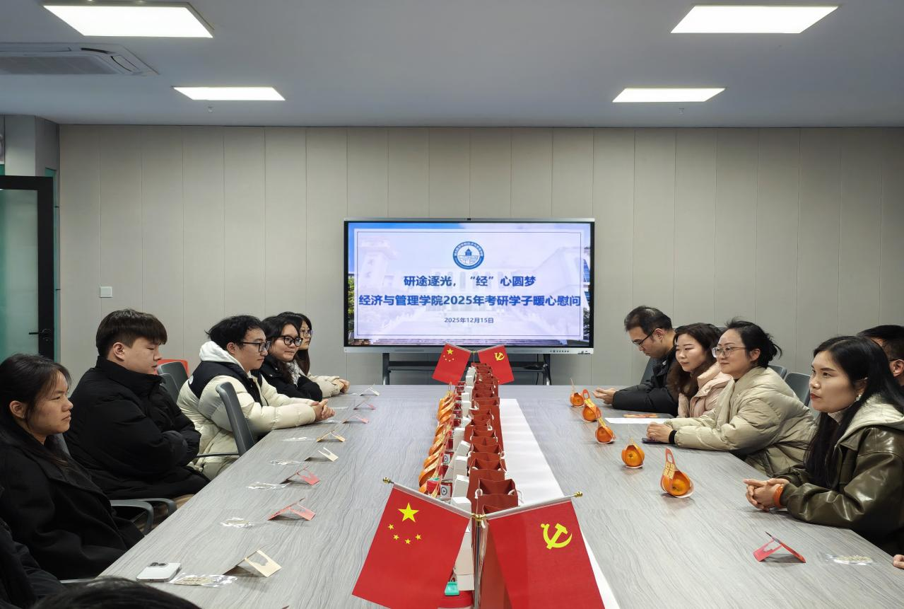 2026届研究生考试在即,为振奋经管学子考研斗志,发挥学院的关怀作用,12月15日和17日,经济与管理学院武汉、咸宁校区接连开展2026届考研学生慰问活动。经济与管理学院院长严良,党总支书记郑洁,副院长孟静、徐刚,党总支副书记郑燕培,分团委书记戴小雨以及各辅导员老师参与此次活动,为考研学子们准备了“经”英上岸能量包和专属祝福卡,为学子们加油打气。