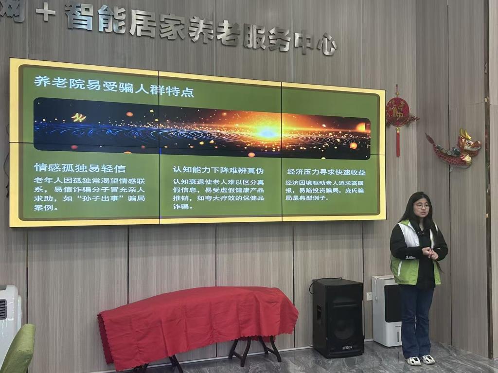 为增强社区老年居民防范金融诈骗的意识和能力,守护好长辈们的“养老钱”,12月15日,经济与管理学院“求实”志愿者服务队前往舒养天伦居家养老服务中心,开展了一场主题为“反诈宣传暖银发,青春守护伴安康”的主题宣讲服务行动。青年志愿者们用专业知识与热情服务,为社区筑起一道温暖的“防骗墙”,助力营造更安全、和谐的邻里环境。