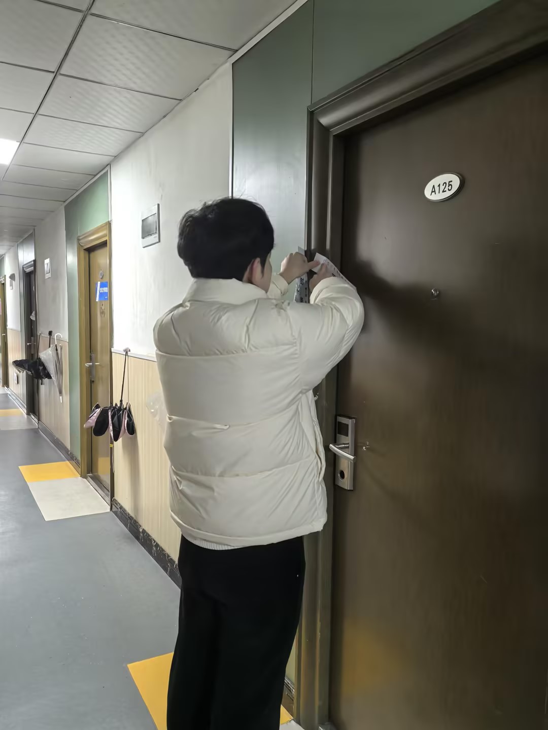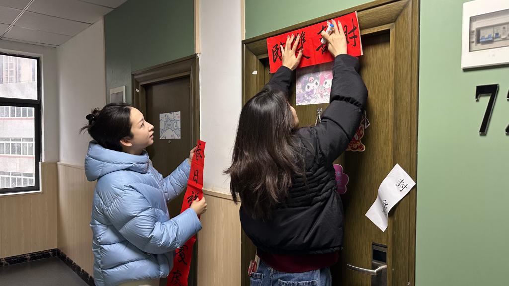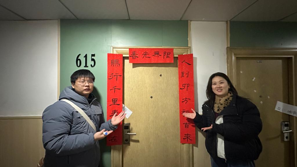 尤为温馨的是,本次活动特别融入了传统文化元素。学院提前组织有书法特长的教师挥毫泼墨,书写了一批承载着新春祝福与励志勉励的原创对联与“福”字。走访过程中,王珉与辅导员们亲手将一副副墨香四溢的春联张贴于学生寝室门廊。“春光无限”“才喜双临”……一副副对联不仅寄托着老师们对学子学业有成、品格高洁的殷切期望,也为略显冷清的离校宿舍楼增添了浓浓的节日暖意与文化气息。王珉表示,贴封条是管理的需要,贴对联是温情的传递,一“封”一“贴”之间,体现的是学院严管与厚爱相结合的学生工作理念,旨在让教育更有温度,让管理更富内涵。