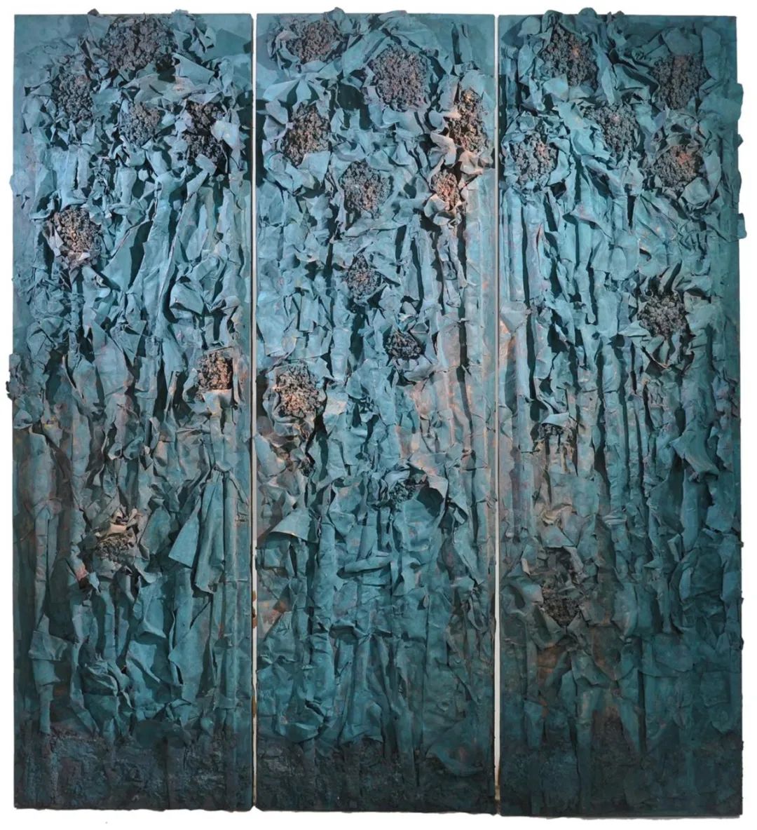 壁画作品《文明之光》表现了向日葵旺盛的生命力,主要材料为纸、矿物色、茶叶、珐琅、胶、墨汁等。绘画元素和主题内容巧妙统一,画面具有斑驳的肌理效果和丰富的层次感,自然材料和合成材料的综合使用凸显出作品的厚重感,体现了民族特性和历史文明之美,人文精神的融入更为壁画作品找到了价值所在。