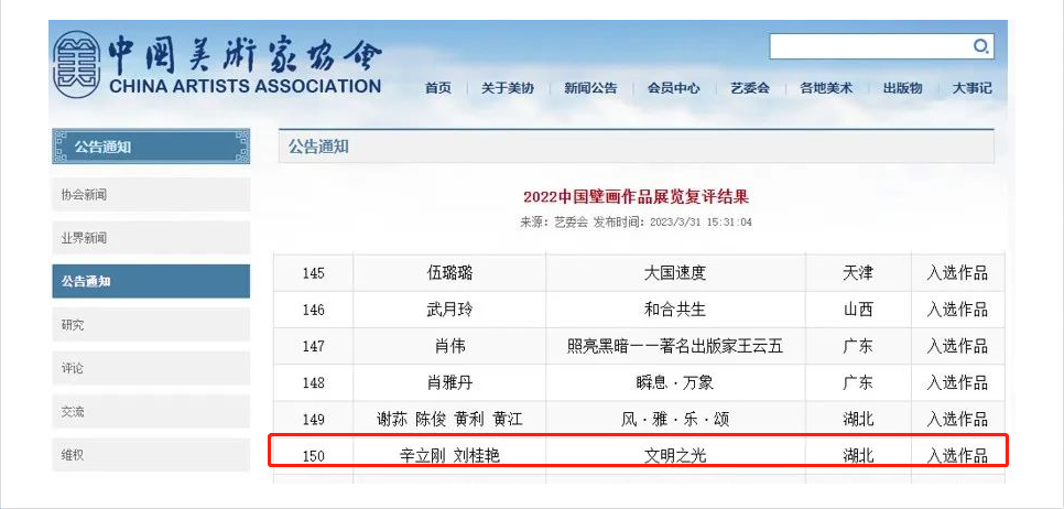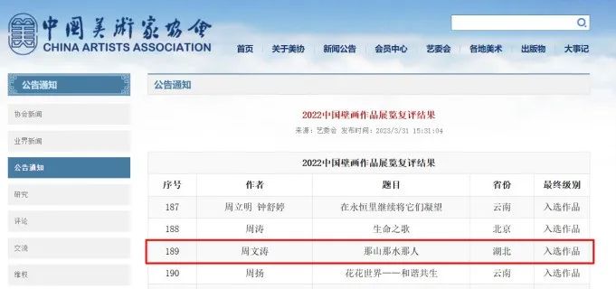 为深入贯彻习近平总书记提出的人类命运共同体意识、中华民族共同体意识,全面展示当代壁画艺术创作与研究成果。3月31日,由中国美术家协会举办的“2022中国壁画作品展”复评结果正式公示,艺术与传媒学院产品设计教研室教师周文涛作品《那山 那水 那人》、视觉传达教研室教师刘桂艳(合作)作品《文明之光》成功入选。