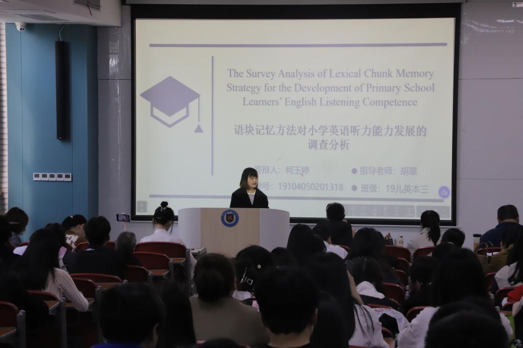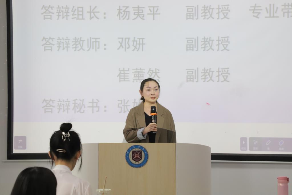 本次公开答辩共有3位同学参加,分别是:2019级翻译本1班李铭宇,2019级外贸本2班龙奇,2019级儿英本3班柯玉婷。答辩过程中,3位同学结合PPT依次进行现场陈述,详细介绍论文的选题背景、研究意义、研究思路、主要内容、研究结论和不足之处。答辩小组成员针对论文内容向学生进行提问,学生现场一一回答。