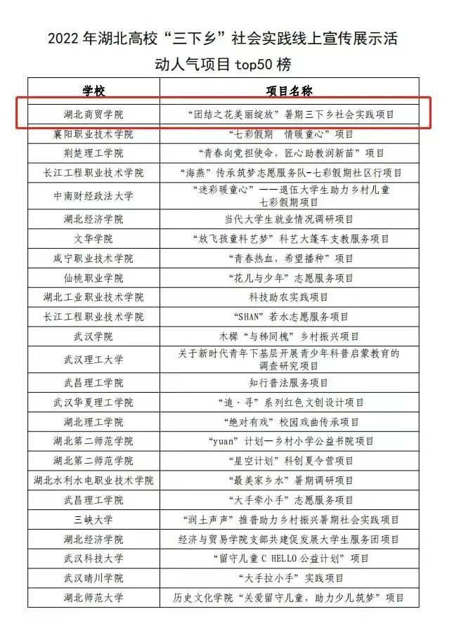 为进一步提升“三下乡”社会实践活动品牌影响力,促进互学互鉴,深化实践育人成效,团省委于11月25日至12月5日开展2022年“三下乡”社会实践线上宣传展示活动,一批实践调研扎实、实践成果突出、育人成效显著的团队和项目从中脱颖而出。根据《关于开展 2022 年“三下乡”社会实践线上宣传展示活动的提示》要求,结合线上点赞热度,艺术与传媒学院“团结之花美丽绽放”暑期三下乡社会实践项目名列人气项目top50榜第1位。