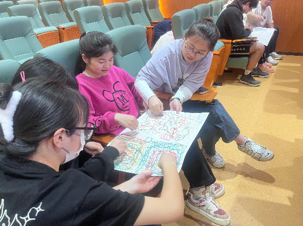 在互动环节,王怡带领同学们进行了音乐涂鸦活动,让同学们带着“审美”的态度共同聆听了一段体现大自然魅力的音乐,并通过绘画的形式展现音乐中与“自然”有关的美感意象。在总结时王怡表示,美虽然因个体的不同而具备差异,但彼此之间是互相交融的,需要用心体会和感受。