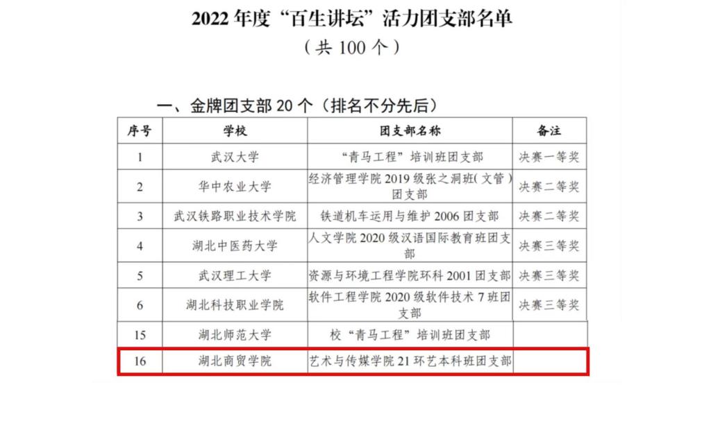 近日,团省委、省学联公布了湖北省2022年度“百生讲坛”——学习宣传贯彻习近平新时代中国特色社会主义思想活动的评选结果,全省117所高校,414个团支部和439位主讲人参与省级遴选。经过学校申报、材料评审、省级赛事遴选等环节,最终,我校艺术与传媒学院2021级环艺本科班团支部荣获“金牌团支部”称号,管理学院2021级电商本2班团支部荣获“铜牌团支部”称号,体育学院吴培培荣获“金牌主讲人”称号,会计学院林静茹荣获“银牌主讲人”称号,系我校参与该项活动的最好成绩。