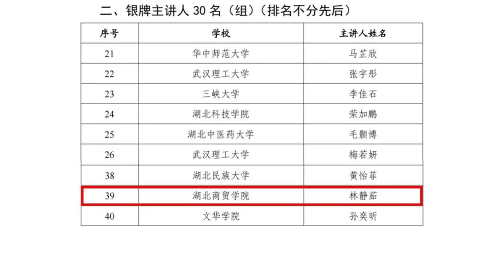 其中,4月2日下午,2022年“百生讲坛”省级活力团支部、优秀主讲人决赛暨示范巡讲在湖北大学小礼堂举行,我校体育学院吴培培同学从全省439个参赛主讲人中脱颖而出、闯入决赛,并在现场带来了精彩展示,最终荣获省级决赛三等奖。