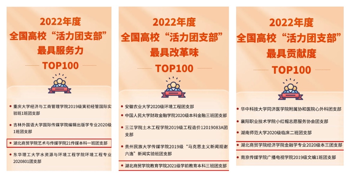 近日,在团中央基层建设部指导中国青年报社开展的2022年度高校“活力团支部”风采展示活动发布评选结果中,我校共有三支团支部荣登榜单。分别为艺术与传媒学院2021级传媒本科一班团支部荣登2022年度全国高校“活力团支部”最具服务力TOP100榜,经济学院20金融本三班团支部荣登2022年度全国高校“活力团支部”最具贡献度TOP100榜,教育学院21学前本三班团支部荣登2022年度全国高校“活力团支部”最具改革味TOP100榜。