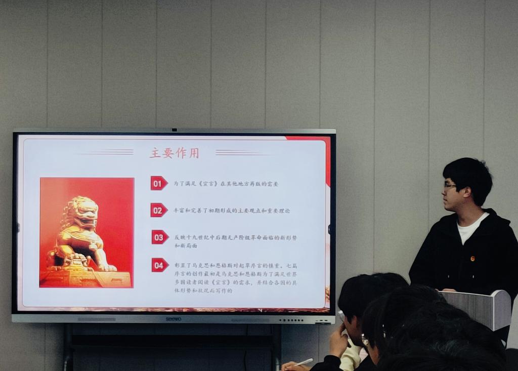 会上,毛顿开同学向同学们介绍了《宣言》序言的主要内容与作用,他介绍到:“中共早期领导人和党员,无不是《宣言》的读者和学习者,他们从中不断汲取知识和精神力量。”陈铭同学向大家阐释了《宣言》序言的当代启示;廖子欣同学重点分享了序言中体现的哲学思想与学习观。
